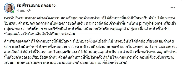 อีกทั้งยังมีการโพสต์ข้อความกราบขออภัยลูกค้าทุกท่านที่ได้รับสินค้าที่ไม่ได้คุณภาพ นอกเหนือจากลูกค้าที่ท่านนี้ ทางบริษัท ยินดีที่จะรับผิดชอบ หากลูกค้าท่านไหนต้องการที่จะติดต่อขอคืนเงิน สามารถติดต่อเจ้าหน้าที่ผ่านไลน์ pimryhelpme หรือเข้ากลุ่มรอของจากพิมรี่พาย ทางบริษัทมีเจ้าหน้าที่แอดมินคอยให้บริการคุณลูกค้าอยู่ค่ะ เมื่อเจ้าหน้าที่ได้รับข้อมูลแล้วจะรีบโอนเงินคืนให้เป็นการเร่งด่วน