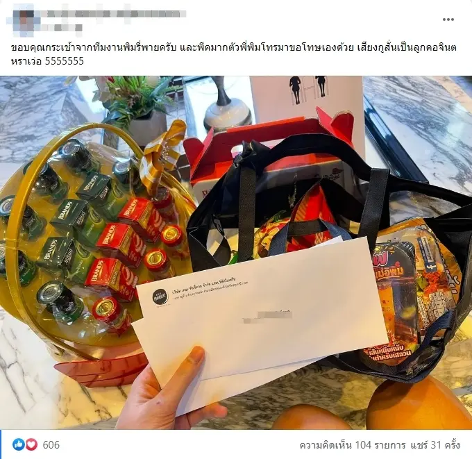 หลังจากที่มีข่าวออกมาไม่นาน ทางด้านของ พิมรี่พาย ก็ได้มีการส่งทีมงานมามอบกระเช้าและผลิตภัณฑ์อื่นๆเพิ่มเติมให้ลูกค้าท่านนี้แล้ว โดยเจ้าของโพสต์ก็ได้บอกว่า พิมรี่พายเองโทรศัพท์สายตรงมาขอโทษด้วยตัวเอง ซึ่งทางด้านเจ้าตัวก็บอกว่าระหว่างที่คุยกับพิมรี่พาย ก็เสียงสั่นเป็นลูกคอของจิตหราเลยทีเดียว
