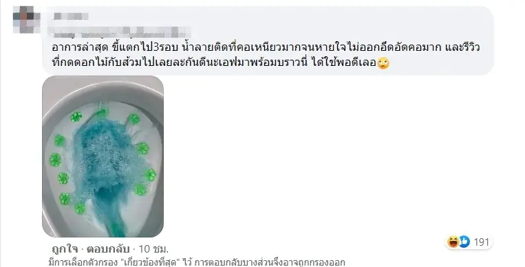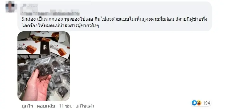 ผู้ใช้เฟซบุ้กรายนี้ยังเผยอีกว่า อาการหลังจากที่กินเข้าไปมีการถ่ายถึง 3 รอบ น้ำลายติดที่คอ เหนียวมากจนหายใจไม่ออก อีกคอมเมนต์หนึ่งก็บอกว่า สั่งซื้อมา 5 กล่อง เป็นเหมือนกันทุกกล่อง กินไปแล้วด้วย ไม่รู้ว่าจะตายมั้ย