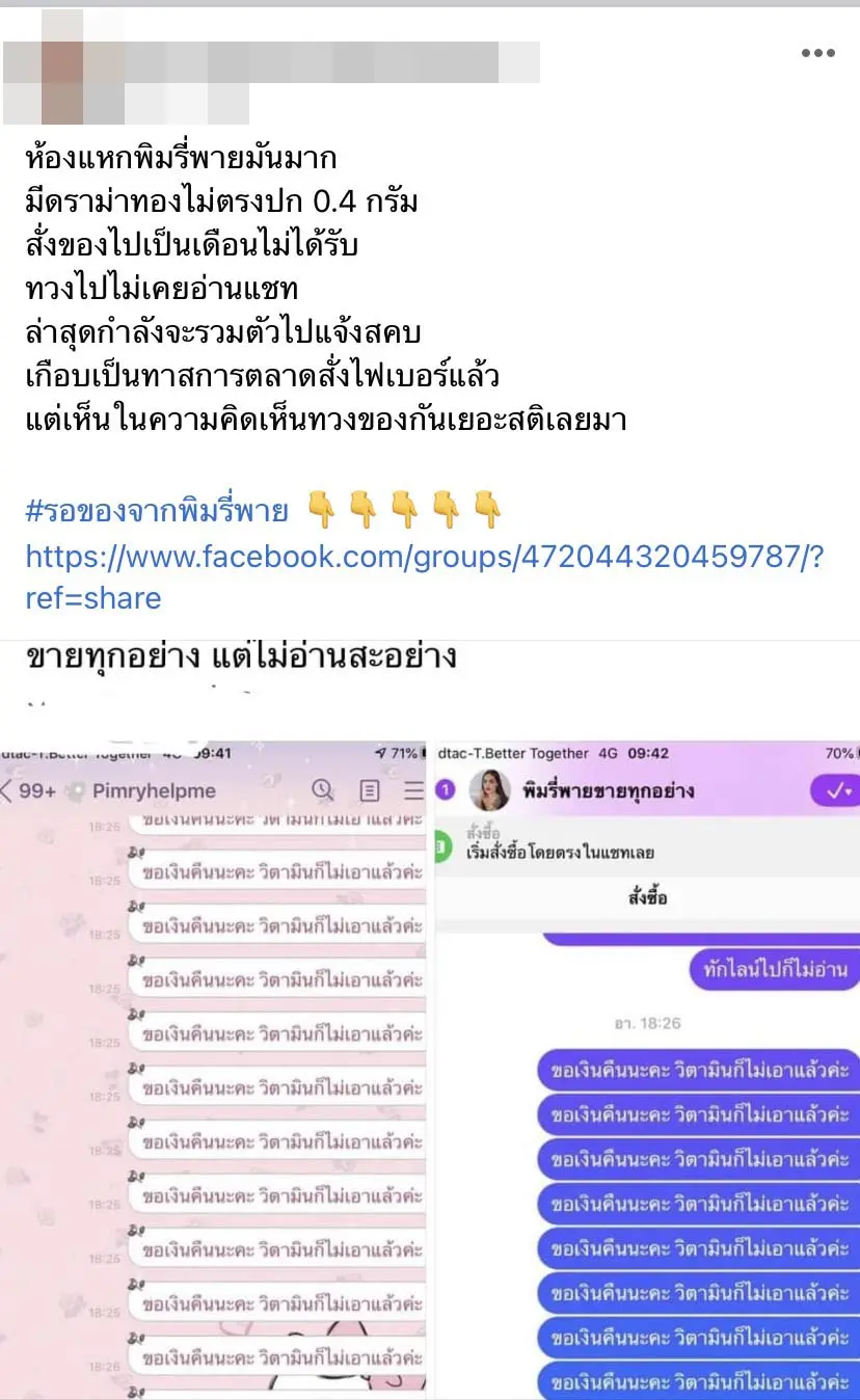 ทั้งนี้ผู้ใช้เฟซบุ๊กคนดังกล่าวยังได้กล่าวว่า “ห้องแหกพิมรี่พายมันมาก มีดราม่าทองไม่ตรงปก 0.4 กรัมสั่งของไปเป็นเดือนไม่ได้รับ ทวงไปไม่เคยอ่านแชทล่าสุดกำลังจะรวมตัวไปแจ้งสคบ.เกือบเป็นทาสการตลาดสั่งไฟเบอร์แล้วแต่เห็นในความคิดเห็นทวงของกันเยอะสติเลยมา”
