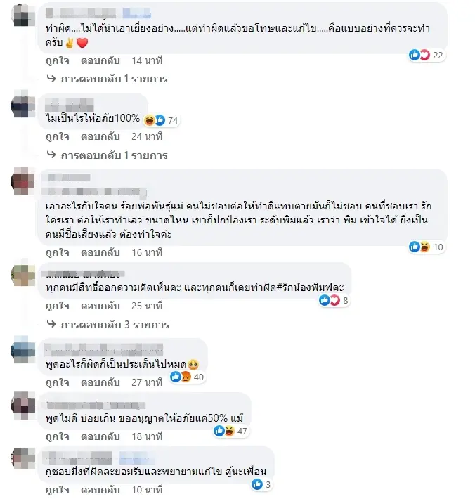 ซึ่งกลังจากที่โพสต์ดังกล่าวได้ออกมาแล้ว ก็มีทางด้านของชาวเน็ต และ แฟนคลับของพิมรี่พาย เข้ามาให้กำลังใจ พร้อมทั้งบอกว่า ทำผิดแล้วออกมาขอโทษคือแบบอย่างที่ควรเอาเป็นเยี่ยงอย่าง แต่อีกด้านหนึ่งก็แสดงความคิดเห็นถึง พิมรี่พาย ว่าผิดพลาดมาแล้วหลายครั้ง โดยได้มีการเอาคำพูดของแม่นักแสดงดังมาใช้ในครั้งนี้ด้วยว่า ให้อภัย 50%