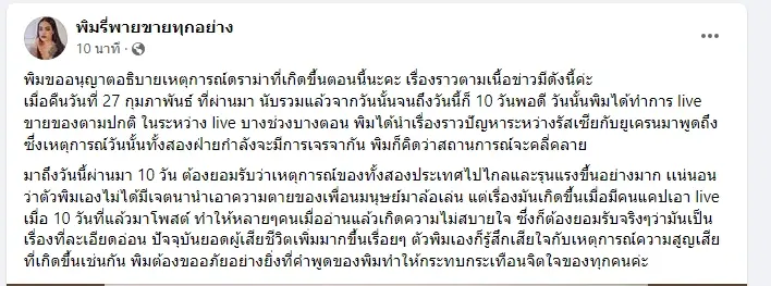 เพจ พิมรี่พายขายทุกอย่าง ขอชี้แจงดราม่า หลังมีคลิป พิมรี่พาย ใช้ถ้อยคำเชิงล้อเลียนสถาการณ์ความรุนแรงระหว่าง ยูเครนและรัสเซีย ขณะไลฟ์สด เผย! ไม่มีเจตนาเอาความเป็นความตายมาล้อเล่น