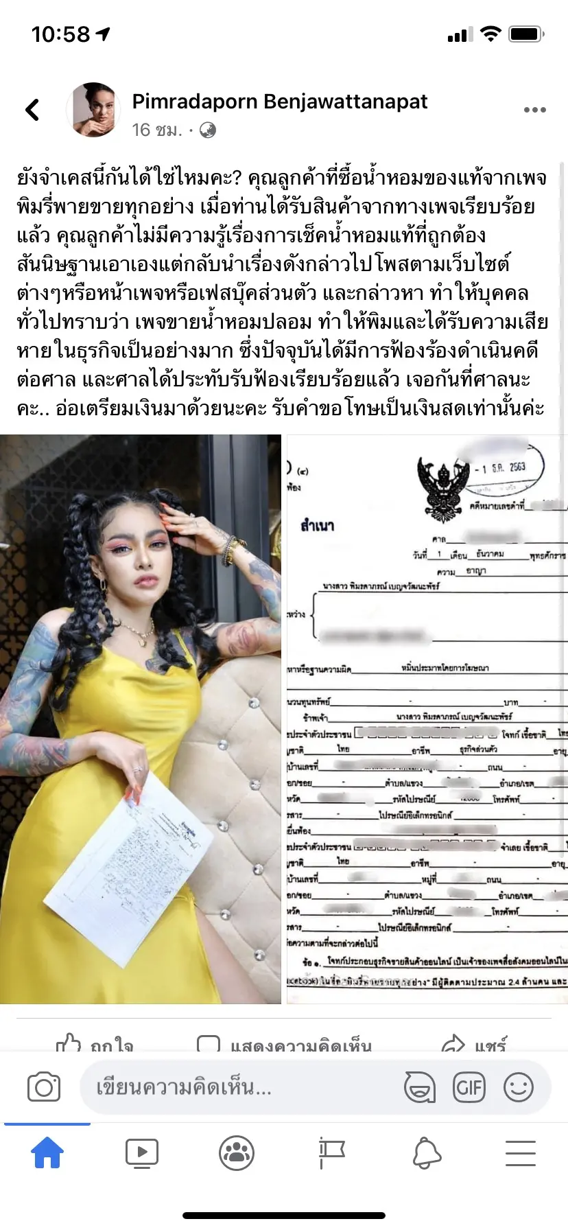 “ยังจำเคสนี้กันได้ใช่ไหมคะ? คุณลูกค้าที่ซื้อน้ำหอมของแท้จากเพจ พิมรี่พายขายทุกอย่าง เมื่อท่านได้รับสินค้าจากทางเพจเรียบร้อยแล้ว คุณลูกค้าไม่มีความรู้เรื่องการเช็คน้ำหอมแท้ที่ถูกต้อง สันนิษฐานเอาเองแต่กลับนำเรื่องดังกล่าวไปโพสตามเว็บไซต์ต่างๆหรือหน้าเพจหรือเฟสบุ๊คส่วนตัว และกล่าวหา ทำให้บุคคลทั่วไปทราบว่า เพจขายน้ำหอมปลอม ทำให้พิมและได้รับความเสียหายในธุรกิจเป็นอย่างมาก ซึ่งปัจจุบันได้มีการฟ้องร้องดำเนินคดีต่อศาล และศาลได้ประทับรับฟ้องเรียบร้อยแล้ว เจอกันที่ศาลนะคะ.. อ่อเตรียมเงินมาด้วยนะคะ รับคำขอโทษเป็นเงินสดเท่านั้นค่ะ”