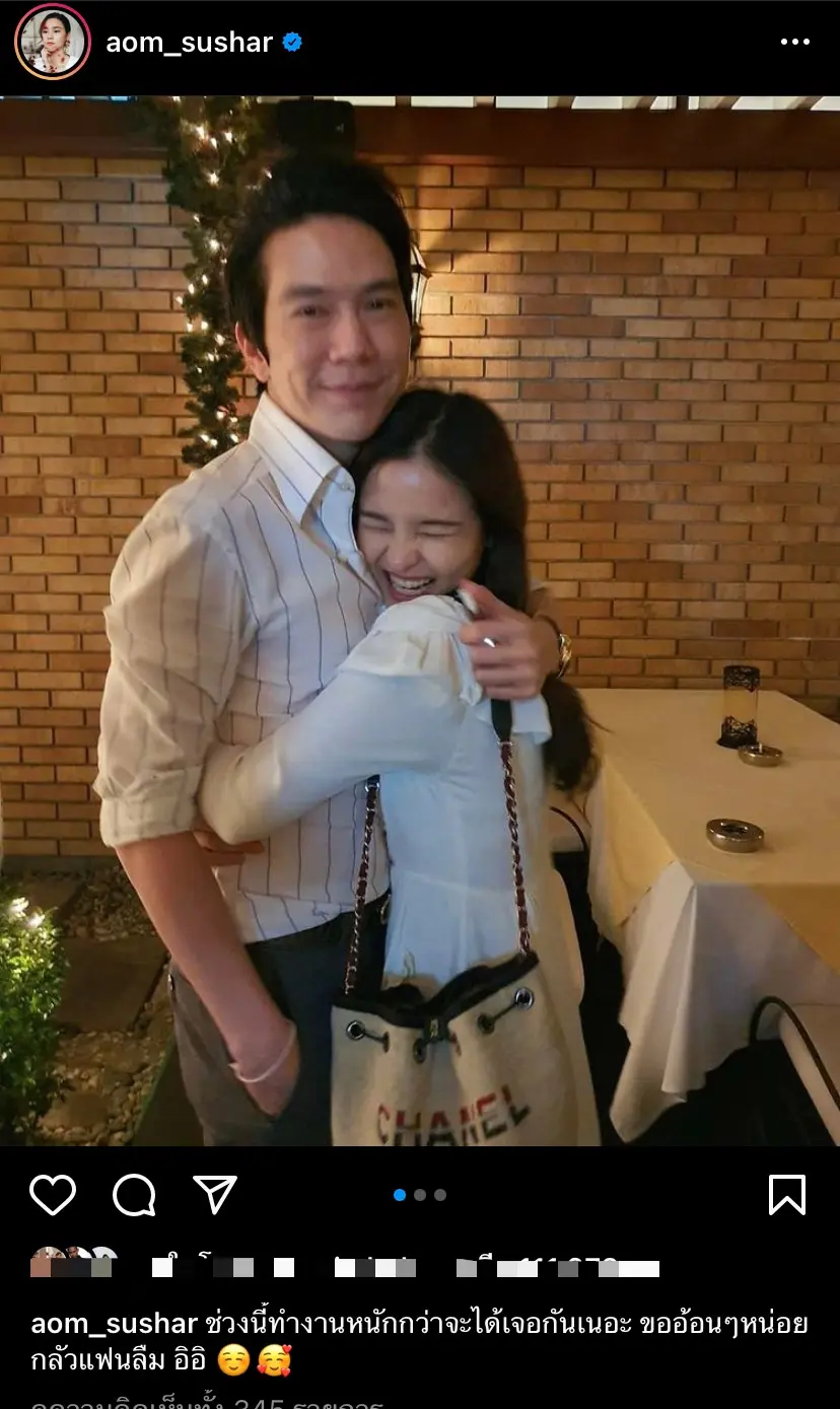 โดยล่าสุด สาวออม ได้ออกมาโพสต์ข้อความพร้อมรูปที่เจ้าตัวและแฟนหนุ่มที่ยืนกอดกัน ทั้งนี้ยังมีแคปชั่นน่ารกๆจากสาวอ้อมที่โพสต์ว่า “ช่วงนี้ทำงานหนักกว่าจะได้เจอกันเนอะ ขออ้อนๆหน่อย กลัวแฟนลืม อิอิ”