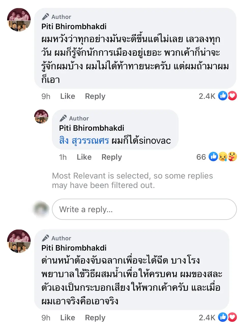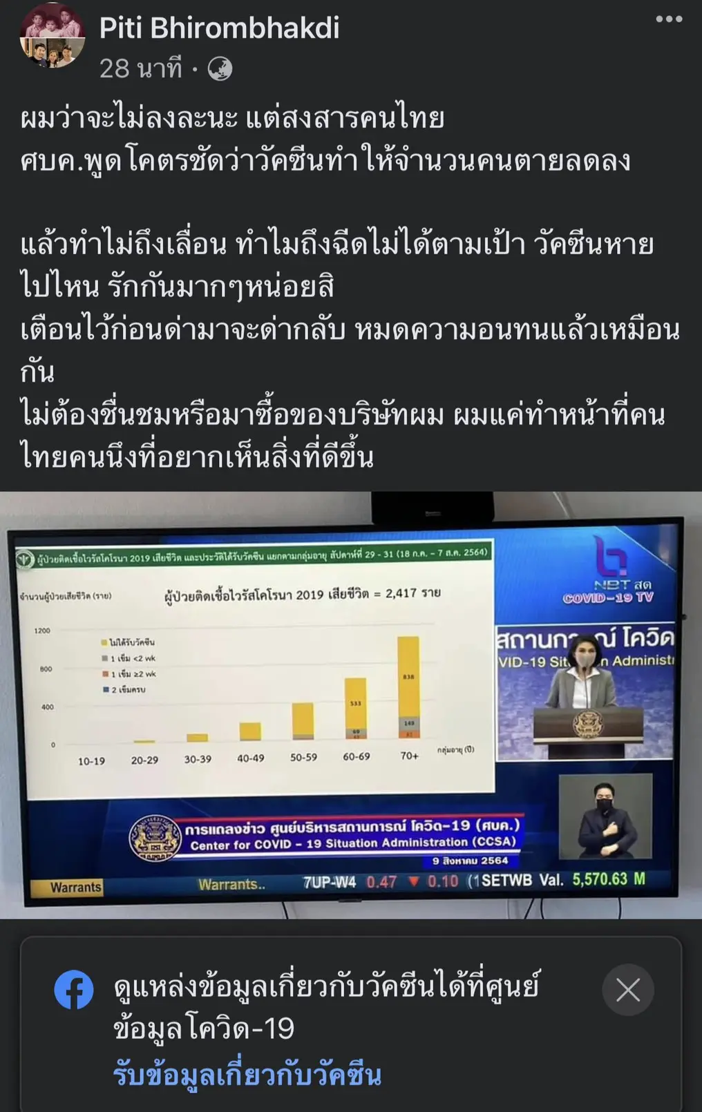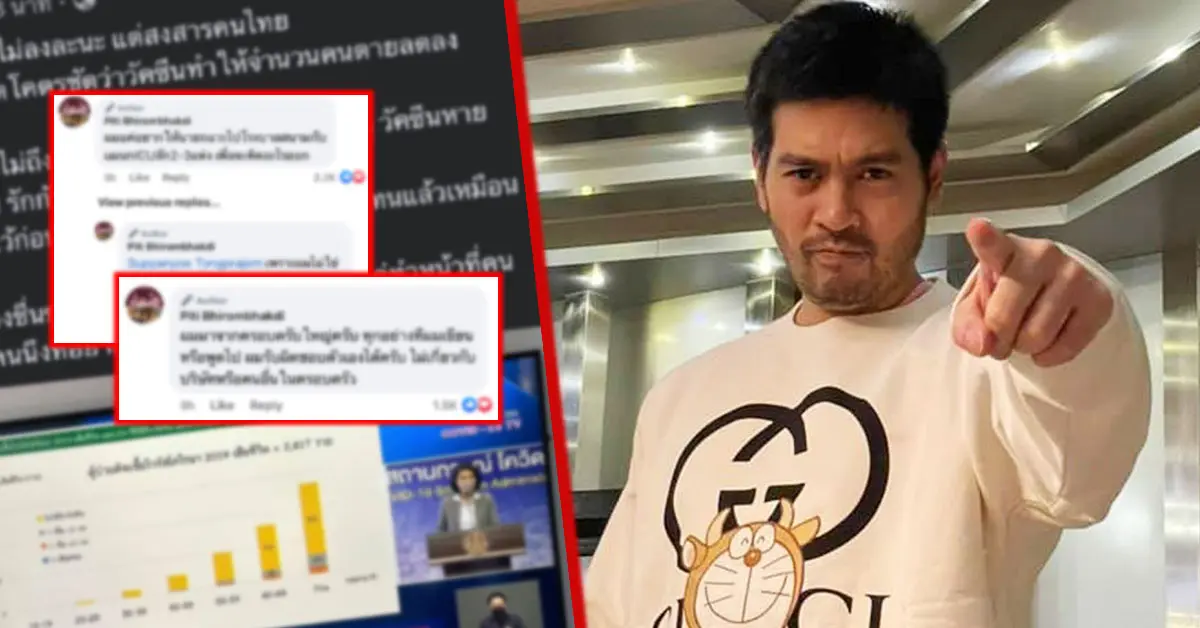 “ผมว่าจะไม่ลงละนะ แต่สงสารคนไทย ศบค.พูดโคตรชัดว่าวัคซีนทำให้จำนวนคนตายลดลง แล้วทำไมถึงเลื่อน ทำไมถึงฉีดไม่ได้ตามเป้า วัคซีนหายไปไหน รักกันมากๆหน่อยสิ เตือนไว้ก่อน ด่ามาจะด่ากลับ หมดความอดทนแล้วเหมือนกัน ไม่ต้องชื่นชมหรือมาซื้อของบริษัทผม ผมแค่ทำหน้าที่คนไทยคนนึงที่อยากเห็นสิ่งที่ดีขึ้น”
