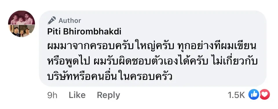 “ผมมาจากครอบครับใหญ่ครับ ทุกอย่างทีผมเขียนหรือพูดไป ผมรับผิดชอบตัวเองได้ครับ ไม่เกี่ยวกับบริษัทหรือคนอื่นในครอบครัว”