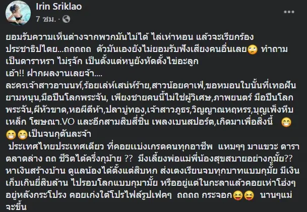 ซึ่งต่อมา เจ้าตัวก็ได้มีการโพสต์ข้อความร่ายยาวต่อเรื่องนี้อีกครั้งว่า “ยอมรับความเห็นต่างจากพวกมันไม่ได้ ไล่เห่าหอน แล้วจะเรียกร้องประชาธิปไตย…ถถถถถ ตัวมันเองยังไม่ยอมรับฟังเสียงคนอื่นเลย