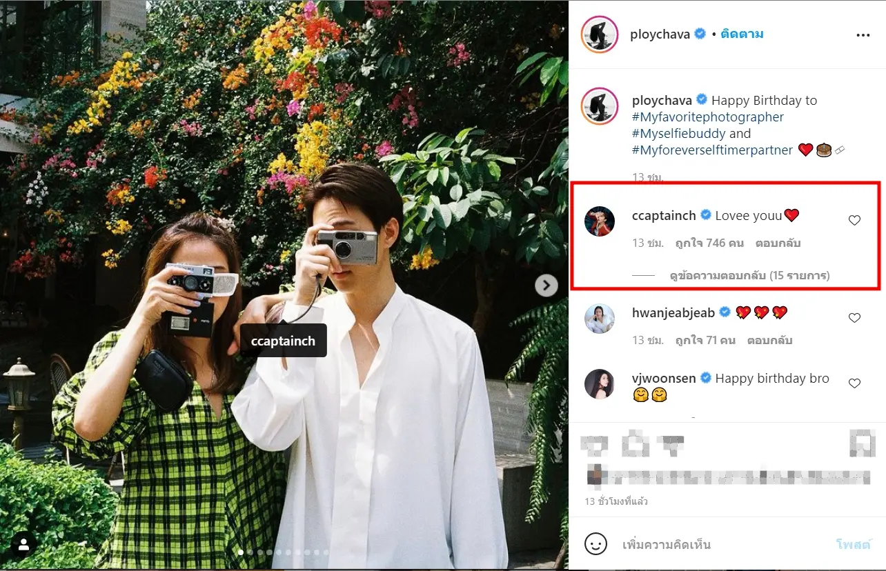 ทั้งนี้หลังจากที่หลอยได้โพสต์ไปแล้วนั้น หนุ่มกัปตัน ก็ได้เข้ามาคอมเมนต์ตอบกลับว่า “Love You” พร้อมอิโมจิหัวใจสีดแงอีกด้วย