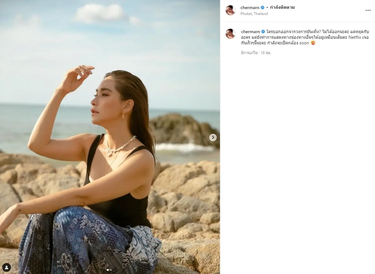 ‘ใครบอกออกจากวงการบันเทิง? ไม่ได้ออกนะคะ แค่หยุดกับละคร แต่ยังทำการแสดงทางช่องทางอื่น ๆ ได้อยู่เหมือนเดิมนะคะ Netflix เจอกันเร็ว ๆ นี้นะคะ กำลังจะเปิดกล้อง soon’