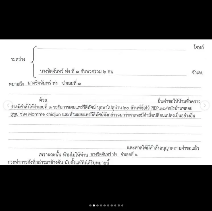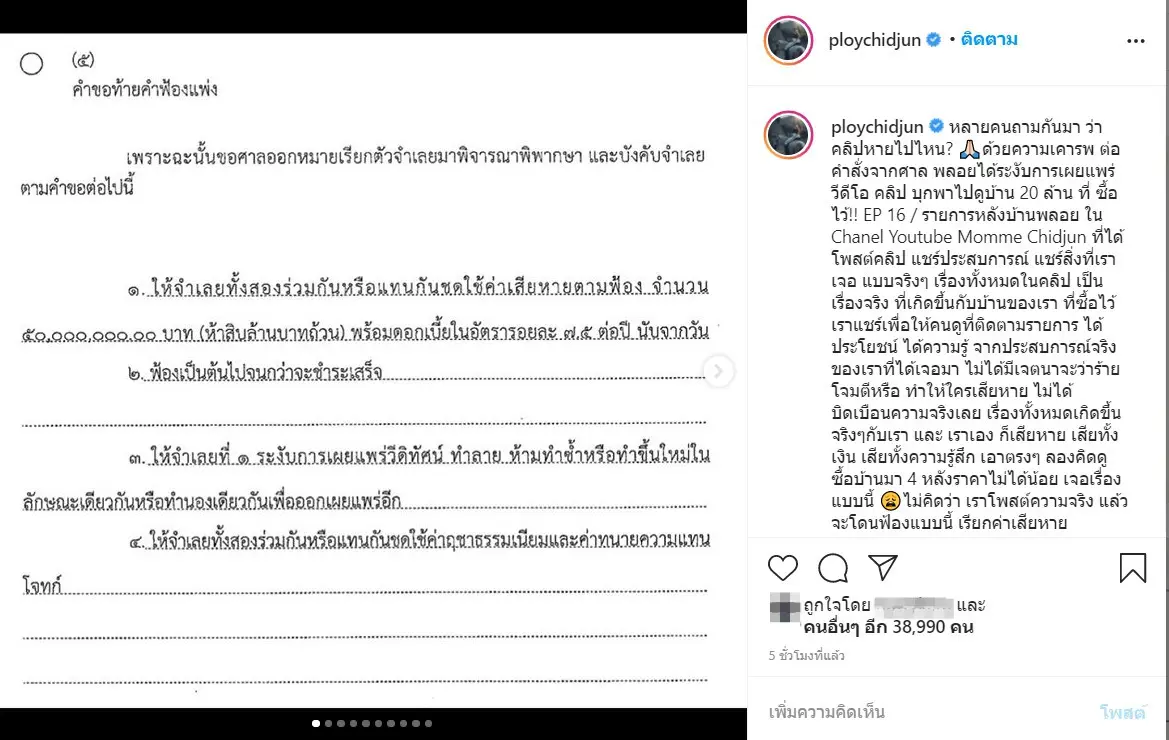 “หลายคนถามกันมา ว่าคลิปหายไปไหน? ??ด้วยความเคารพ ต่อ คำสั่งจากศาล พลอยได้ระงับการเผยแพร่ วีดีโอ คลิป บุกพาไปดูบ้าน 20 ล้าน ที่ ซื้อไว้!! EP 16 / รายการหลังบ้านพลอย ใน Chanel Youtube Momme Chidjun ที่ได้โพสต์คลิป แชร์ประสบการณ์ แชร์สิ่งที่เราเจอ แบบจริงๆ เรื่องทั้งหมดในคลิป เป็นเรื่องจริง ที่เกิดขึ้นกับบ้านของเรา ที่ซื้อไว้ เราแชร์เพื่อให้คนดูที่ติดตามรายการ ได้ประโยชน์ ได้ความรู้ จากประสบการณ์จริงของเราที่ได้เจอมา ไม่ได้มีเจตนาจะว่าร้าย โจมตีหรือ ทำให้ใครเสียหาย ไม่ได้บิดเบือนความจริงเลย เรื่องทั้งหมดเกิดขึ้นจริงๆกับเรา และ เราเอง ก็เสียหาย เสียทั้งเงิน เสียทั้งความรู้สึก เอาตรงๆ ลองคิดดู ซื้อบ้านมา 4 หลังราคาไม่ได้น้อย เจอเรื่องแบบนี้ ?ไม่คิดว่า เราโพสต์ความจริง แล้วจะโดนฟ้องแบบนี้ เรียกค่าเสียหาย 50,000,000 บาท ตกใจมาก กลัวไปหมด ไม่รู้ว่า ที่เราทำ มันมีความผิด ด้วยหรอ ? ในฐานะผู้บริโภค ที่ซื้อบ้านมา แล้วเกิดปัญหาตั้งแต่ปีแรก ตั้งแต่ยังไม่เข้าอยู่เลย ผนังบ้านก็มีราขึ้น ถึงวอลเปเปอร์จะปิดไว้แต่ก็เอาไม่อยู่ รามันออกมาตลอดแบบน่ากลัวมาก แก้ยังไงก็ไม่หาย ไม่จบ หนักเลยเจอปัญหาน้ำรั่ว ซึมฝ้าลงมาจากชั้นบน สะสมมาเรื่อยๆ จนต้องรื้อฝ้า เปิดฝ้าหมด ?สีภายนอกรอบตัวบ้านก็ลอก ตั้งแต่แรกจนถึงตอนนี้ ก็ยังต้องซ่อมแซม ปัญหามันเยอะ มีอีกหลายจุด จนตอนนี้เลยต้องจ้างบริษัทตรวจบ้าน มาตรวจทั้ง 4 หลัง มาเทส เช็ค สแกนบ้านให้หมด ระบบไฟ ระบบน้ำ โครงสร้าง ทุกอย่าง ดูว่าสาเหตุของปัญหาอยู่ตรงไหน เพราะอะไร จะได้แก้ไข เราซ่อมแซม มาเรื่อยๆ ทุกปี ไม่เคยหาย กลับมาเป็นอีก คิดดู เราเสียความรู้สึกแค่ไหน ยังมาโดนฟ้องอีก ???? ซื้อบ้านมา อยากได้ที่อยู่แล้วปลอดภัย อบอุ่น อยู่แล้วสบายใจ แต่เรื่องที่เจอ ทั้งเชื้อรา น้ำรั่ว ปัญหาต่างๆ ทำให้กังวลไปหมด อย่างเชื้อรา หายใจเข้าไปจะกระทบสุขภาพรึเปล่า เราคอยซ่อม แก้ไขปัญหา บ้านเราซื้อมาแล้ว บ้านก็บ้านเรา เราจะพูดความจริงว่าบ้านเรามีปัญหาอะไร ก็โดนแบบนี้ คือ งง มาก มีใครเคยเจอแบบนี้มั้ย หรือใครมีเรื่องแบบเดียวกัน แชร์ แนะนำ พลอยที พลอยควรจะทำยังไง? ตอนนี้กำลังปรึกษาทนาย แต่ เอาจริงๆ เราไม่อยากมีเรื่องกับใคร เสียเวลาทำงานนะ แต่พลอยก็เชื่อมั่นในความจริง ความจริงเป็นสิ่งไม่ตาย พลอยจะเลือกอยู่ข้างความจริง ถ้าจะต้องสู้ ก็จะสู้ เพราะ มันคือเรื่องจริง เราจะไม่มีสิทธิ์พูด หรือ บอก เรื่องจริง แชร์ประสบการณ์ เพื่อให้คนอื่นได้รู้ ได้เกิดประโยชน์เลยหรอ ?เครียดนะ ไม่รู้ต้องทำยังไง ตอนนี้บอกตัวเองสู้ๆๆๆปัญหามีไว้แก้ บ้าน