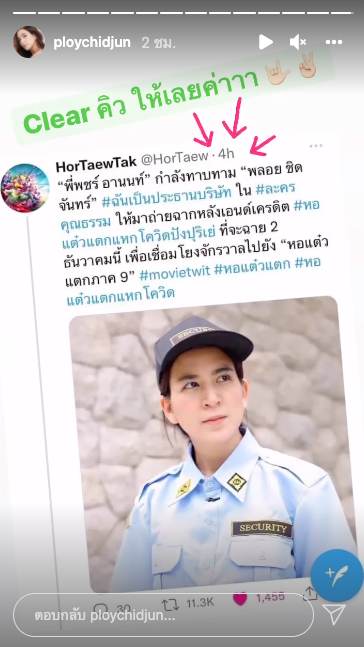 ด้านพลอย ชิดจันทร์ ไม่รอช้ารู้ข่าวนี้ปุ๊บ เจ้าตัวก็ลงไอจีสตอรี่พร้อมเคลียร์คิวให้พี่พชร์ทันทีหากติดต่อมาให้ไปร่วมเล่นภาพยนตร์หอแต๋วแตก งานนี้คงต้องรอลุ้นว่าจะได้เห็นกระแส #ประธานบริษัท ในหอแต๋วแตกหรือเปล่า