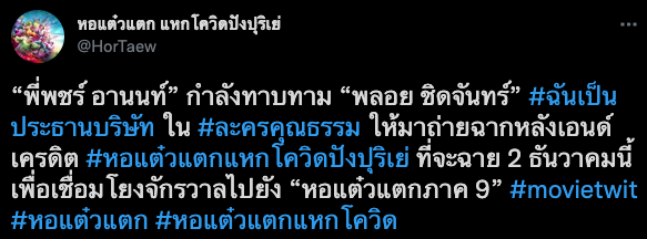 เป็นกระแสฟีเวอร์แบบสุดๆสำหรับ #ประธานบริษัท ที่มาจากหนังสั้นใน TikTok ของพลอย ชิดจันทร์ ทันทีที่เป็นกระแสก็มีทวิตเตอร์ของ หอแต๋วแตก แหกโควิดปังปุริเย่ โพสต์แจ้งข่าวว่า “พี่พชร์ อานนท์” กำลังทาบทาม “พลอย ชิดจันทร์” #ฉันเป็นประธานบริษัท ใน #ละครคุณธรรม ให้มาถ่ายฉากหลังเอนด์เครดิต #หอแต๋วแตกแหกโควิดปังปุริเย่ ที่จะฉาย 2 ธันวาคมนี้ เพื่อเชื่อมโยงจักรวาลไปยัง “หอแต๋วแตกภาค 9” #movietwit #หอแต๋วแตก #หอแต๋วแตกแหกโควิด