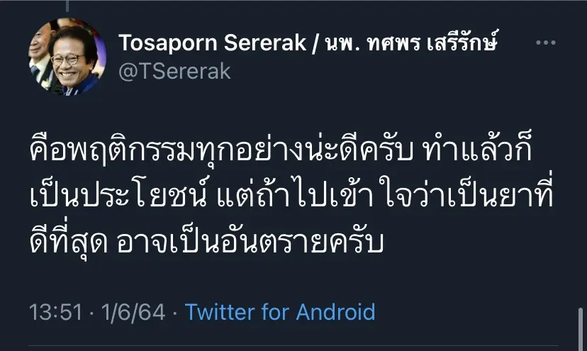 “คือพฤติกรรมทุกอย่างน่ะดีครับ ทำแล้วก็เป็นประโยชน์ แต่ถ้าไปเข้าใจว่าเป็นยาที่ดีที่สุด อาจเป็นอันตรายครับ”