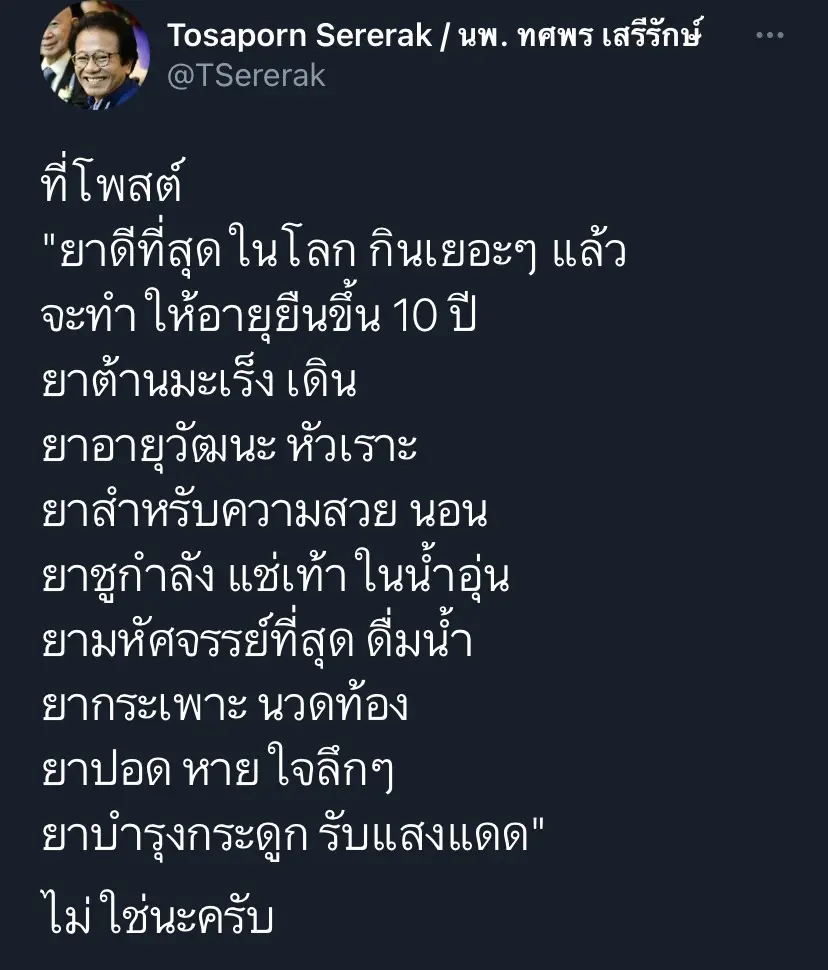 ล่าสุด นพ. ทศพร เสรีรักษ์ ได้มีการโพสต์ข้อความผ่านทางทวิตเตอร์ว่า “ที่โพสต์ ยาที่ดีที่สุดในโลก กินเยอะๆ แล้วจะทำให้มีอายุยืนขึ้น 10 ปี ยาต้านมะเร็ง เดิน ยาอายุวัฒนะ หัวเราะ ยาสำหรับความสวย นอน ยาชูกำลัง แช่เท้าในน้ำอุ่น ยามหัศจรรย์ที่สุด ดื่มน้ำ ยากะเพาะ นวดท้อง ยาปอด หายใจลึกๆ ยาบำรุงกระดูก รับแสงแดด ไม่ใช่นะครับ”