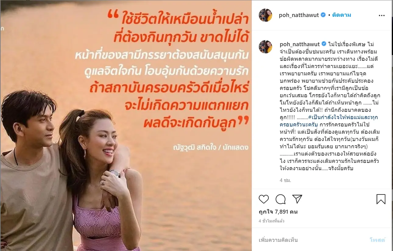 และยังระบุแคปชั่นว่า “ไม่ใช่เรื่องพิเศษ ไม่จำเป็นต้องชื่นชมนะครับ เราเดินทางพร้อมข้อผิดพลาดมากมายระหว่างทาง เรื่องไม่ดีและเรื่องที่ไม่ควรทำตามเยอะแยะ…….แต่เราพยายามครับ เราพยายามแก้ไขจุดบกพร่อง พยายามช่วยกันประคับประคองครอบครัว โชคดีมากๆที่เรามีลูกเป็นข้อยกเว้นเสมอ โกรธยังไงก็หายได้ถ้าคิดถึงลูก โมโหยังยังไงก็ลืมได้ถ้าเห็นหน้าลูก …….ไม่ไหวยังไงก็ทนได้!! ถ้านึกถึงอนาคตของลูก!!!!! ………#เป็นกำลังใจให้พ่อแม่และทุกครอบครัวนะครับ การรักครอบครัวไม่ใช่หน้าที่! แต่เป็นสิ่งที่ต้องดูแลทุกวัน ต้องเติมความรักทุกวัน ต้องใส่ใจทุกวัน(บางวันผมก็ทำไม่ได้นะ ยอมรับเลย ยากมากจริงๆ) ………..เราแต่งตัวของเราเองให้สวยหล่อยังไง เราก็ควรจะแต่งเติมความรักในครอบครัวให้งดงามอย่างนั้น…..จริงมั้ยครับ”