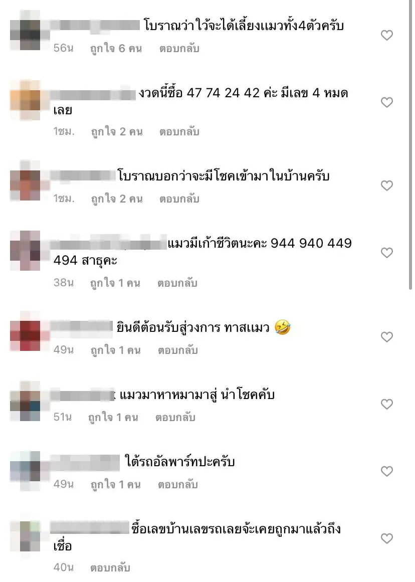 ส่วนทางเน็ตที่เข้ามาเห็น ต่างก็พากันตีความหมายออกมาเป็นตัวเลย ซึ่งส่วนใหญ่ก็จะบอกว่าเลข 4 เพราะมีลูกแมว 4 ตัว กับเลข 9 เพราะเป็นแมว9ชีวิต บางส่วนก็บอกให้ซื้อตามเลขทะเบียนรถที่แม่แมวมาคลอดไว้เลย เพราะถือว่าเอาโชคลาภมาให้แล้ว