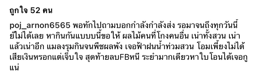 และตอนนี้ทางด้านของเพจผลไม้ก็ลบ Facebook ทิ้งไปแล้ว งานนี้เจ้าตัวบอก ไม่ได้เสียดายเงินแต่มันเจ็บใจ ขอเวลากลับไปหาใบโอนก่อน ลั่นเลยว่า ได้เจอกูแน่!