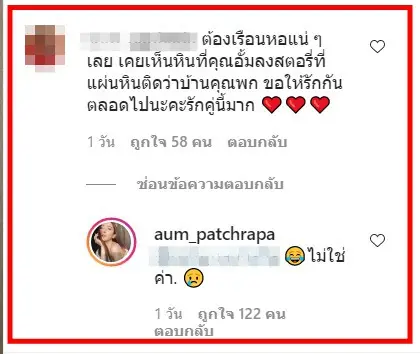 ทั้งนี้ก็ทำให้เหล่าชาวเน็ตที่เป็นแฟนคลับก็พากันไปคอมเมนต์ว่า “ต้องเรือนหอแน่ ๆ เลย เคยเห็นหินที่คุณอั้มลงสตอรี่ที่แผ่นหินติดว่าบ้านคุณพก ขอให้รักกันตลอดไปนะคะรักคู่นี้มาก” แต่อั้มเองก็ไม่ปล่อยให้แฟนคลับคิดไปเอง ก็ได้เข้าไปตอบคอมเมนต์ดังกล่าวว่า “ไม่ใช่ค่า” ต่อท้ายด้วยอิโมจิหน้ายิ้ม ถึงแม้จะออกมาเคลียร์ชัดเจนแล้วว่าไม่ใช่เรือนหอ แต่เหล่าแฟนคลับเองก็รอให้ถึงวันดีๆในวันนั้นอย่างเร็ววันอีกด้วย