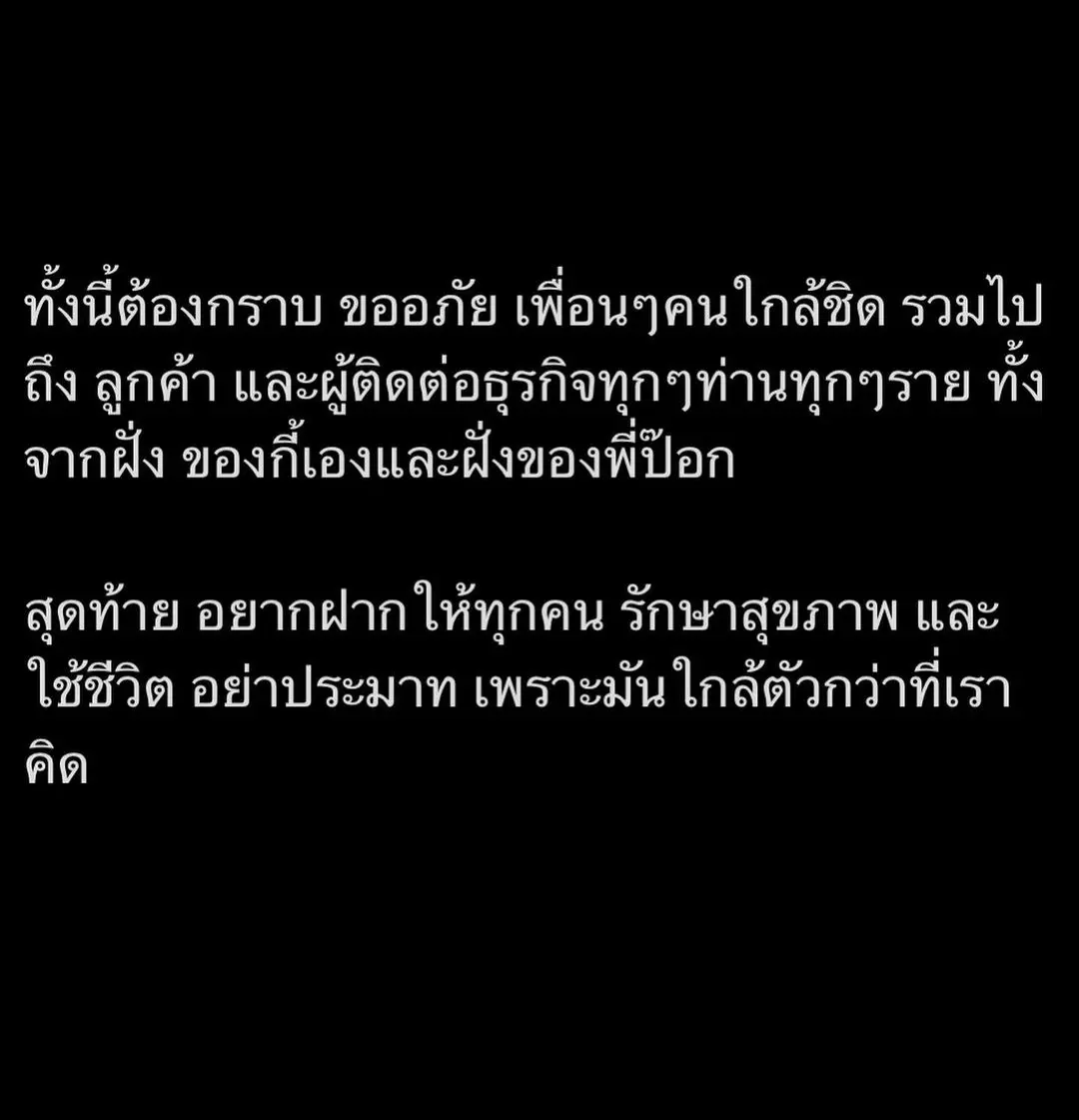 ทั้งนี้ต้องกราบ ขออภัย เพื่อน ๆ คนใกล้ชิด รวมไปถึงลูกค้า และผู้ติดต่อธุรกิจทุกๆท่าน ทุกๆราย ทั้งจากฝั่งของกี้เอง และฝั่งของพี่ป๊อก