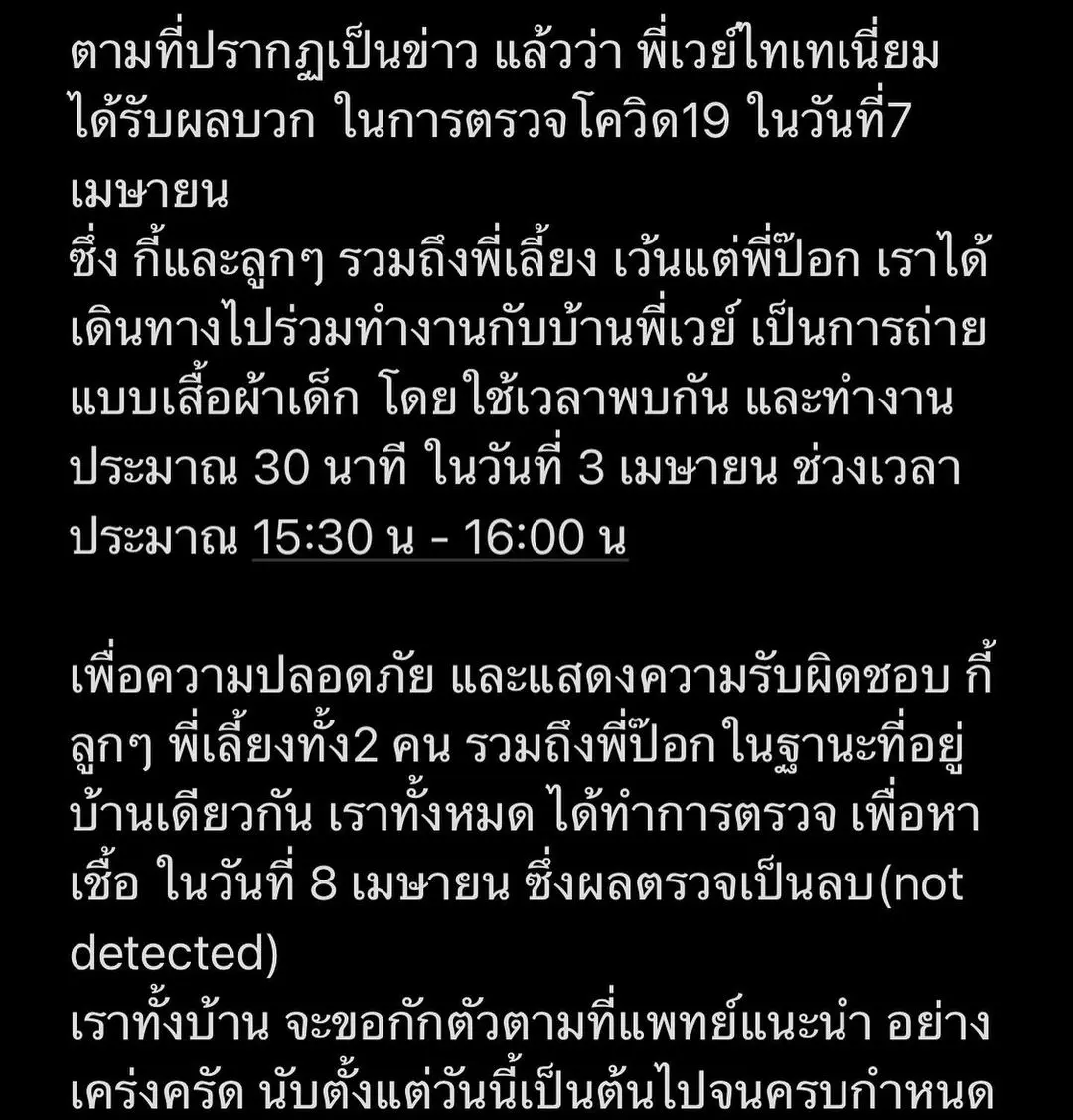 “ตามที่ปรากฏเป็นข่าว แล้วว่า พี่เวย์ไทยเทเนี่ยมได้รับผลบวก ในการตรวจโควิด19 ในวันที่ 7 เมษายน ซึ่ง กี้และลูก ๆ รวมถึงพี่เลี้ยง เว้นแต่พี่ป๊อก เราได้เดินทางไปร่วมทำงานกับบ้านพี่เวย์ เป็นการถ่ายแบบเสื้อผ้าเด็ก โดยใช้เวลาพบกัน และทำงานประมาณ 30 นาที ในวันที่ 3 เมษายน ช่วงเวลาประมาณ 15.30 น. – 16.00 น.