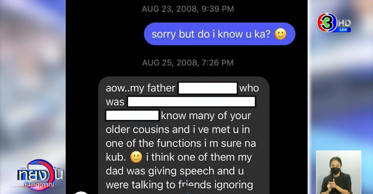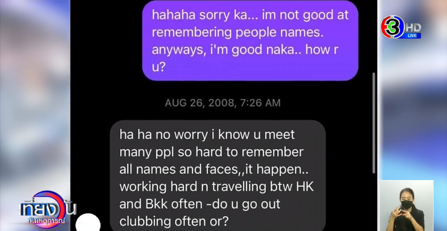 โดยไฮโซสาวได้เล่าให้ฟังว่าเมื่อปี 2551 ก่อนที่จะรู้จักกัน อดีตรองหัวหน้าพรรคคนนี้ ณ ตอนนั้นยังไม่ได้เป็นรองหัวหน้าพรรค ได้มีการแชตมาจีบเธอ โดยพูดประมาณว่า สวัสดีครับ สบายดีไหม ทำอะไรอยู่ พร้อมทั้งแนะนำตัวเป็นภาษาอังกฤษ ทางด้านไฮโซคนดังกล่าวก็ได้ตอบกลับไปในทำนองว่า เรารู้จักกันเหรอ? ซึ่งทางฝั่งนั้นก็บอกว่า พ่อฉันชื่อนี้ไง พ่อฉันก็ไปปราศรัยบ่อย ๆ คุณเองน่าจะเจอ ขณะเดียวกัน ฝ่ายหญิงก็ได้ตอบกลับไปว่า ฉันขอโทษ ฉันจำไม่ได้ ฉันเป็นคนที่จำคนไม่ได้เลย