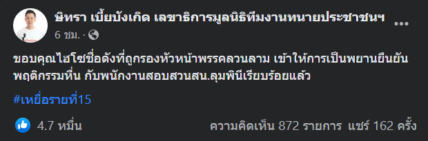 ยังคงเป็นประเด็นที่สังคมให้ความสนใจ กรณีนักการเมืองรายหนึ่ง ได้ทำการ ล่วงละเมิดหญิงสาว จนพบผู้ตกเป็นเหยื่อถึง 14 รายแล้วก่อนหน้านี้ ล่าสุด (20 เม.ย. 65) ทนายษิทรา เบี้ยบังเกิด หรือ ทนายตั้ม ได้เปิดเผยความเคลื่อนไหวเกี่ยวกับประเด็นดังกล่าวผ่านทางเพจ หลังปรากฏพบ เหยื่อรายที่ 15 โดยระบุว่า…