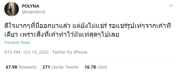 นะ polycat หลังจากที่มีข่าวการปล่อยตัว แอมมี่ The Bottom Blues ออกจากเรือนจำคลองเปรมเมื่อวันที่ 19 ตุลาคมที่ผ่านมา ในคืนเดียวกันนั้น นะ polycat ซึ่งเป็นเพื่อนกับแอมมี่ ก็ได้ออกมาโพสต์ลงในทวิตเตอร์ส่วนตัว แสดงถึงความยินดีที่แอมมี่ได้ถูกปล่อยตัวออกมา โดยเขียนไว้ดังนี้ “ดีใจมาก ๆ ที่มี่ออกมาแล้ว แต่ยังไม่แชร์ รอแชร์รูปเท่ ๆ จากเขาทีเดียว เพราะสิ่งที่เขาทำไว้มันเท่สุด ๆ ไปเลย”