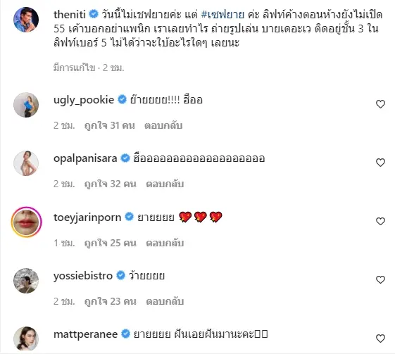 ซึ่งทันทีที่ประตูลิฟท์เปิดออกพร้อมกับเจ้าหน้าที่จำนวนมาก เจ้าตัวก็ได้ร้องขอบคุณและแสดงความดีใจ และรีบนำตัวเองเองออกมาจากลิฟท์โดยด่วน วันนี้ไม่เชฟยายแล้ว แต่เป็น #เซฟยาย แทน