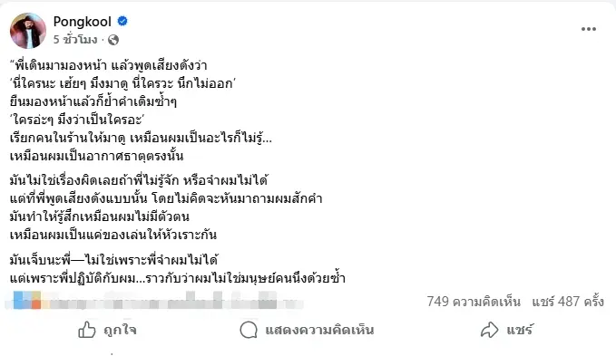 ป๊อป ปองกูล นักร้อง – ศิลปินเสียงอบอุ่นเจ้าของเพลงฮิตมากมาย ออกมาโพสต์ระบายความรู้สึกผ่านทางเฟซบุ๊ก หลังเจอเหตุการณ์ที่ทำให้รู้สึกเหมือนถูกลดคุณค่าความเป็นมนุษย์กลางร้านอาหาร