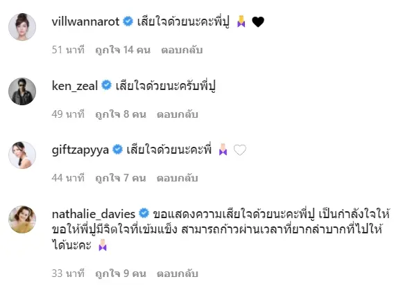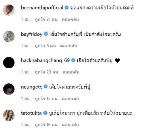พร้อมแคปชั่นว่า “รักนู๋ที่สุด” และแท็กไปยังอินสตาแกรมแฟนสาว ซึ่งมีแฟนสนิท แฟนในวงการบันเทิง รวมถึงแฟนคลับเข้ามาแสดงความเสียใจจำนวนมาก