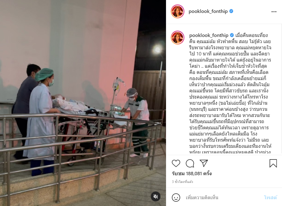 เรียกว่าเป็นอีกหนึ่งเรื่องราวที่สาว ปุ๊กลุก ฝนทิพย์ ช็อคและใจเสียเป็นอย่างมาก เมื่อ คุณแม่ ได้หกล้ม หัวฟาดพื้นสลบตอนกลางคืน โดยปุ๊กลุกก็ได้ออกมาเล่าประสบการณ์ดังกล่าวให้ทุกคนฟังผ่านอินสตาแกรมส่วนตัวเมื่อเช้านี้ ว่า