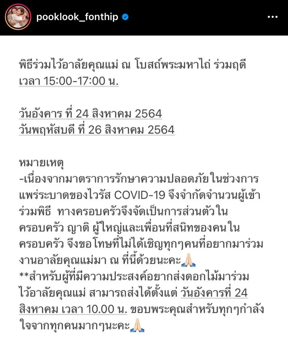 ล่าสุดเมื่อคืนวานนี้ ปุ๊กลุก ได้ออกมาอัปเดตข่าวเพิ่มเติมถึงพิธีงานไว้อาลัยคุณแม่ ว่า