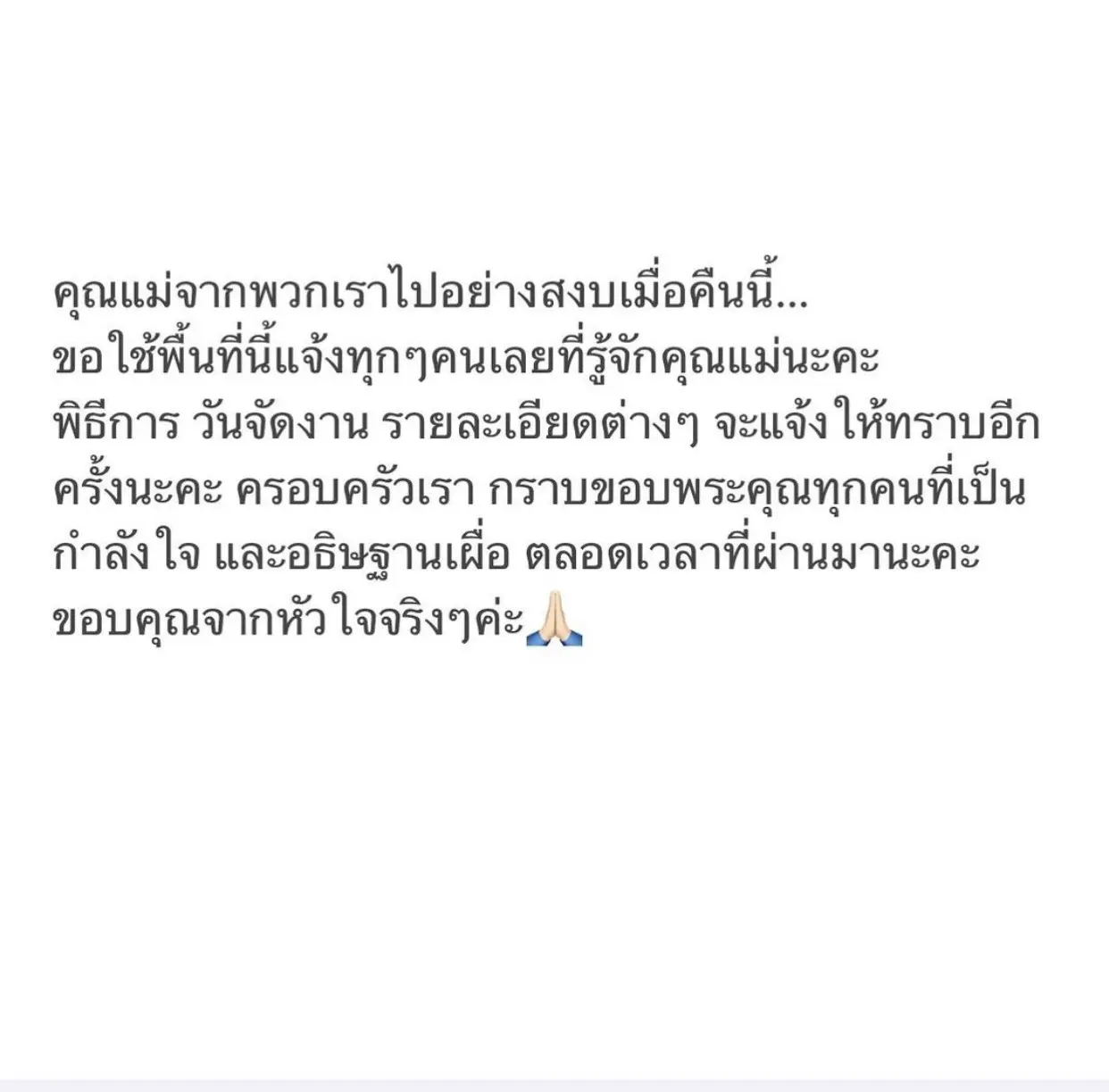 คุณแม่จากพวกเราไปอย่างสงบเมื่อคืนนี้…ขอใช้พื้นที่นี้แจ้งทุกๆคนเลยที่รู้จักคุณแม่นะคะ พิธีการ วันจัดงาน รายละเอียดต่างๆ จะแจ้งให้ทราบอีกครั้งนะคะ ครอบครัวเรา กราบขอบพระคุณทุกคนที่เป็นกำลังใจ และอธิษฐานเผื่อ ตลอดเวลาที่ผ่านมานะคะ ขอบคุณจากหัวใจจริงๆค่ะ