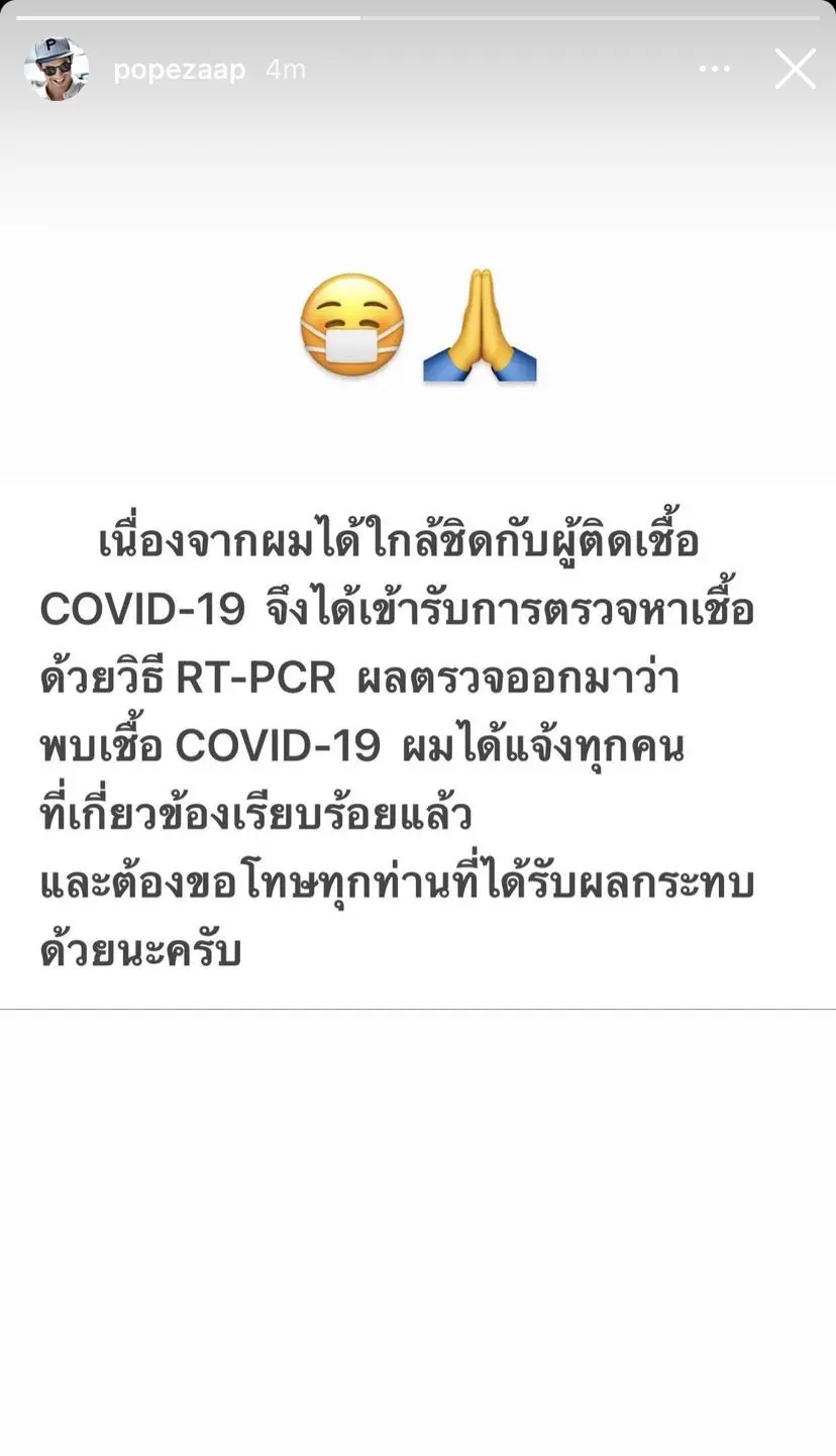 พระเอกหนุ่มชื่อดัง โป๊ป ธนวรรธน์ ออกมาแจ้งข่าวติดเชื้อ โควิด19 ผ่านทางสตอรี่อินสตาแกรม เช้าวันนี้ 21 มีนาคม 2565 โดยระบุข้อความว่า เนื่องจากผมได้ใกล้ชิดกับผู้ติดเชื้อ COVID-19 จึงได้เข้ารับการตรวจหาเชื้อ ด้วยวิธี RT-PCR ผลตรวจออกมาว่า พบเชื้อ COVID-19 ผมได้แจ้งทุกคนที่เกี่ยวข้องเรียบร้อยแล้วและต้องขอโทษทุกท่านที่ได้รับผลกระทบด้วยนะครับ หากมีความคืบหน้าอย่างไร ทีมข่าวบันเทิง Bright Today จะแจ้งให้ทราบต่อไป