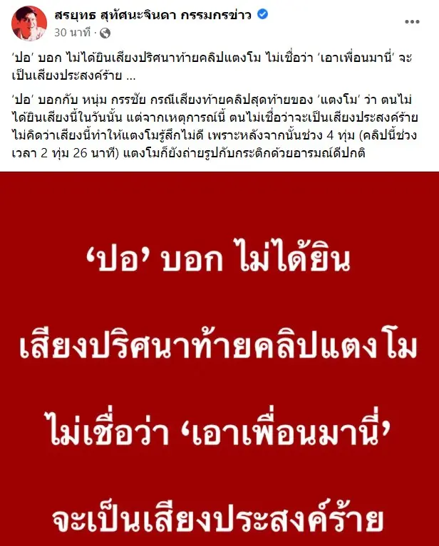 ล่าสุด (3 มี.ค. 65) แฟนเพจ สรยุทธ สุทัศนะจินดา กรรมกรข่าว ได้อัปเดตความเคลื่อนไหวเกี่ยวกับกรณีดังกล่าว เนื่องจาก ปอ หนึ่งในกลุ่มเพื่อนบนเรือบอกว่า ไม่ได้ยินเสียงปริศนาท้ายคลิป แตงโม นิดา โดยในแฟจเพจระบุว่า…