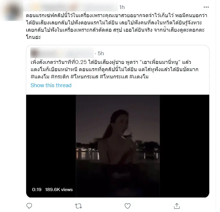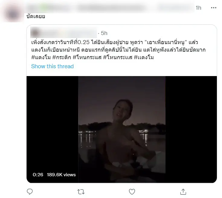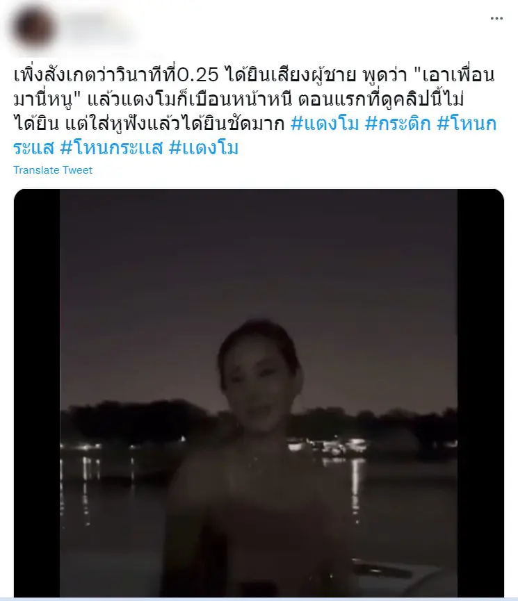 จากกรณีผู้ใช้งานทวิตเตอร์รายหนึ่งได้นำคลิปวิดีโอของ แตงโม นิดา ขณะร้องเพลงอยู่บนเรือ มาโพสต์อธิบายถึงความผิดปกติบางอย่างที่เธอสังเกตได้ โดยระบุว่า ‘เพิ่งสังเกตว่าวินาทีที่ 0.25 ได้ยินเสียงผู้ชายพูดว่า เอาเพื่อนมานี่หนู แล้วแตงโมก็เบือนหน้าหนี ตอนแรกที่ดูคลิปนี้ไม่ได้ยิน แต่ใส่หูฟังแล้วได้ยินชัดมาก’