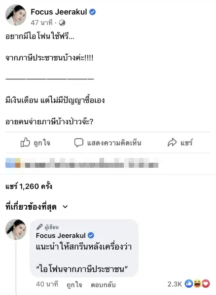 ด้านอีกทางด้านหนึ่งอย่าง โฟกัส จีระกุล ก็ได้มีการออกเคลื่อนไหวถึงประเด็นนี้เช่นกัน โดยเป็นโพสต์ข้อความผ่านทางเฟซบุ๊กของตัวเองว่า อยากได้ไอโฟนฟรี…..จากภาษีประชาชนใช้บ้างค่ะ ซึ่งใต้โพสต์เจ้าตัวก็ได้ไปคอมเมนต์ต่ออีกว่า “แนะนำให้สกรีนหลังเครื่องว่า ไอโฟนฟรีจากภาษีประชาชน” โพสต์นี้ ก็มีคนเข้ากดไลก์และร่วมคอมเมนต์กันเป็นจำนวนมาก