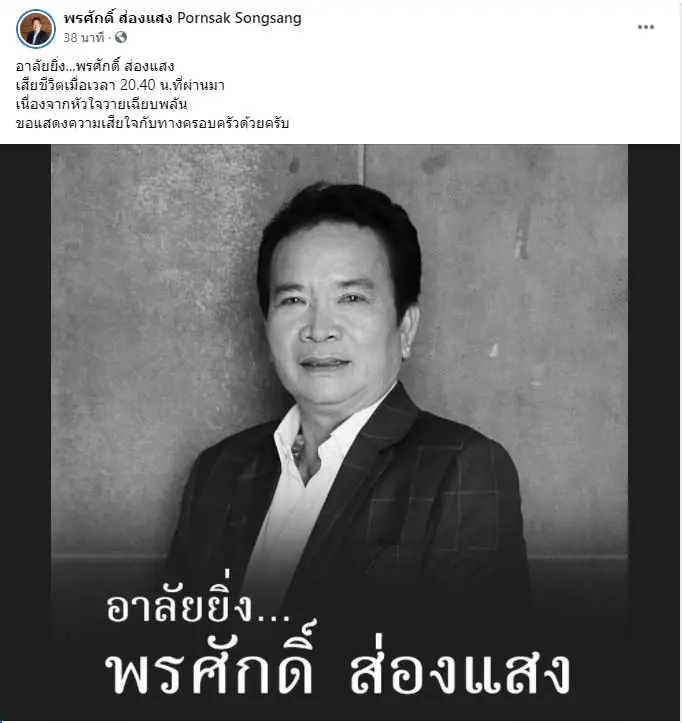 พรศักดิ์ ส่องแสง ตำนานวงการเพลงลูกทุ่งฉายา แขนซ้ายลายมังกร เสียชีวิตแล้วด้วยวัย 60 ปี จากอาการหัวใจวายเฉียบพลัน