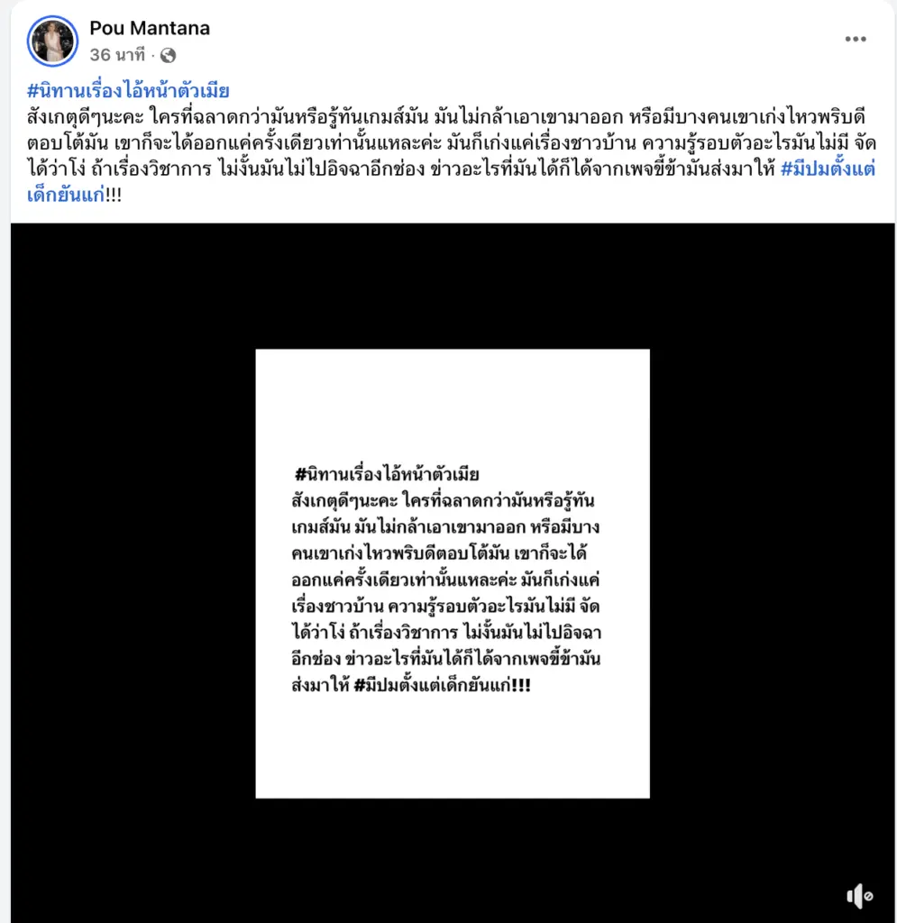 เกิดดราม่าใหม่ในวงการบันเทิงอีกเเล้ว เมื่อ ปู มัณฑนา นักแสดงสาวรุ่นใหญ่ ได้ออกมาโพสต์ข้อความยาวในโซเชียล เล่าถึง “นิทาน” เรื่อง “ไอ้หน้าตัวเมีย” พร้อมแซะแรงว่า เมื่อไหร่ที่มีคนฉลาด รู้ทันเกม มันจะไม่ยอมให้คนนั้นออกหน้า หรือถ้าคนที่เก่งตอบโต้ได้ ก็ได้ออกแค่ครั้งเดียวเท่านั้น