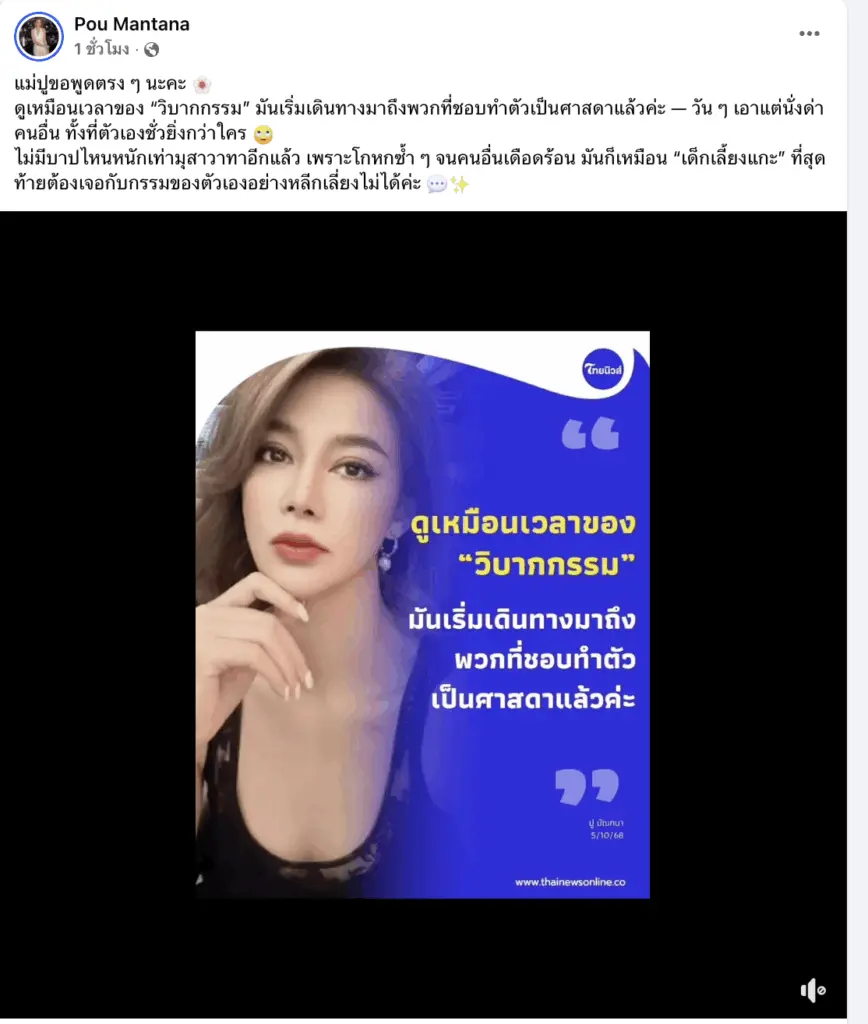 ดูเหมือนเวลาของ ‘วิบากกรรม’ มันเริ่มเดินทางมาถึงพวกที่ชอบทำตัวเป็นศาสดาแล้วค่ะ — วัน ๆ เอาแต่นั่งด่าคนอื่น ทั้งที่ตัวเองชั่วยิ่งกว่าใคร 🙄”