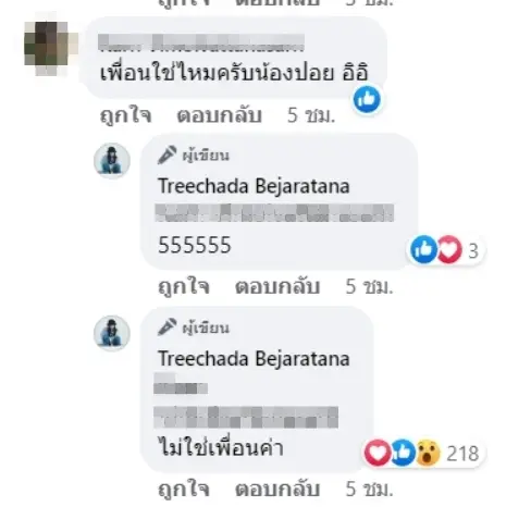 ล่าสุดไม่ต้องเดากันอีกต่อไป เพราะมีคนเข้าไปคอมเมนต์ถามใต้รูปภาพดังกล่าวแล้วว่า “เพื่อนใช่ไหมครับน้องปอย อิอิ” กะว่าจะให้เจ้าตัวมาบอกว่า ว่าใช่ค่ะเพื่อนกัน ประมาณนี้หรือเปล่า แต่ก็ทำเอาหนุ่ม ๆ หลายคนอกหักกันเป็นแถว ที่เจ้าตัวเข้าคอมเมนต์ด้วยคอมเมนต์ว่า “ไม่ใช่เพื่อนค่า” มีคนเข้ามากดว้าวให้กับคอมเมนต์ของเจ้าตัวกันไม่น้อย