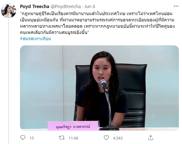 และอีกหนึ่งสิ่งที่หลายๆคนต่างออกมาเรียกร้อง นั่นก็คือการ สมรสเท่าเทียม ล่าสุด ปอย ตรีชฎา Miss Tiffany’s Universe 2004 ได้มีการออกมาแสดงความคิดเห็นว่า
