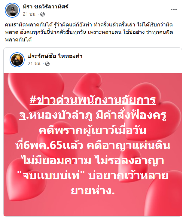 โดย เอ๋ มิรา ก็ได้แชร์ข้อความดังกล่าวไปยังเฟซบุ๊กส่วนตัว พร้อมคำบรรยาย ‘คนเราผิดพลาดกันได้ รู้ว่าผิดแต่ก็ยังทำ ทำครั้งแล้วครั้งเล่า ไม่ได้เรียกว่าผิดพลาด สังคมทุกวันนี้น่ากลัวขึ้นทุกวัน เพราะหลายคนใช้ข้ออ้างว่าทุกคนผิดพลาดกันได้’