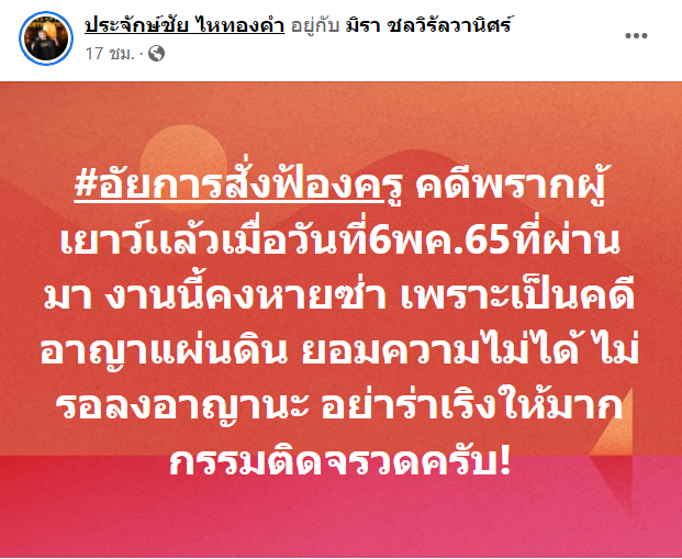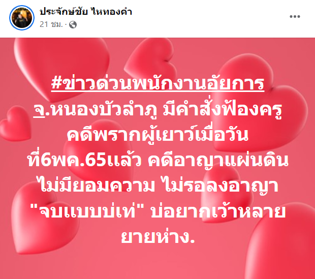 ซึ่งหากย้อนกลับไปก่อนหน้านี้ ประจักษ์ชัย ไหทองคำ ได้โพสต์ข้อความเกี่ยวกับคดีพรากผู้เยาว์ด้วยเช่นกัน โดยระบุว่า ‘ข่าวด่วน พนักงานอัยการ จ.หนองบัวลำภู มีคำสั่งฟ้องครูคดีพรากผู้เยาว์ เมื่อวันที่ 6 พ.ค. 65 แล้ว คดีอาญาแผ่นดิน ไม่มียอมความ ไม่รอลงอาญา จบแบบบ่เท่ บ่อยากเว้าหลาย ยายห่าง’