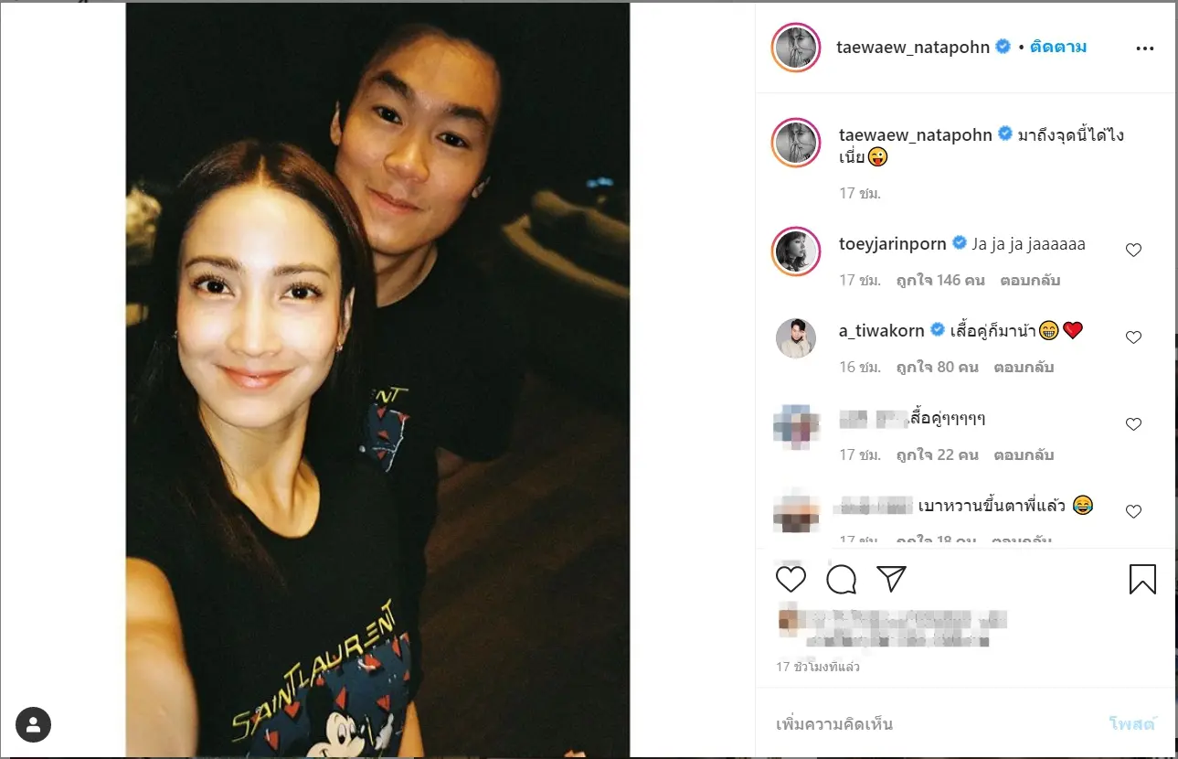โดยล่าสุดทั้งคู่ก็เพิ่งได้มีโอกาสฉลองครบรอบ 6 เดือนกันไป ด้วยการไปดินเนอร์หวานๆกันสองคน ต่อมา สาวแต้วก็ได้โพสต์ภาพเธอและแฟนหนุ่มลงตามปกติ แต่ที่ไม่ปกติก็คงเป็นเพราะเสื้อคู่ที่ทั้งคู่ใส่เหมือนกัน เรียกได้ว่าน่ารักเป็นอย่างมาก แต่งานนี้แต้วก็ได้ระบุแคปชั่นน่ารักด้วยการแซวตัวเองเอาไว้ว่า “มาถึงจุดนี้ได้ไงเนี่ย” ทำเอามีเหล่าเพื่อนๆและชาวเน็ตต่างก็เข้ามาคอมเมนต์แซวกันยกใหญ่เลยทีเดียว