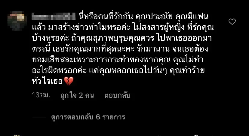 แต่ภายในคอมเมนต์นั้นก็มีหญิงสาวปริศนาเข้ามาคอมเมนต์ยาวในทำนองที่ว่า เป็นคนรักของไฮโซณัย แต่ถูกทิ้งขว้าง มาก่อนแต้ว แต่ไม่ได้รับการเปิดตัว