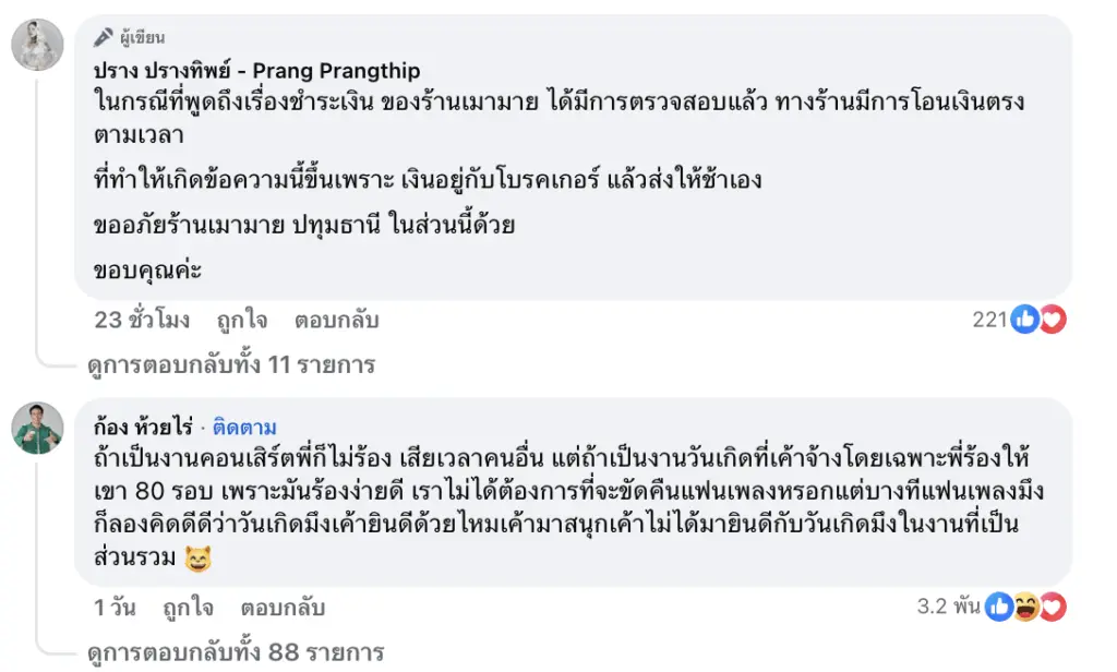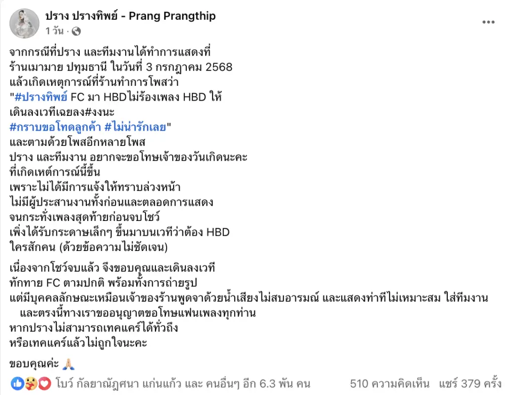 กลายเป็นดราม่าร้อนในโลกโซเชียล หลังนักร้องสาว ปรางทิพย์ ถูกวิจารณ์จากร้านแห่งหนึ่งว่าไม่ยอมร้องเพลงอวยพรวันเกิดให้ลูกค้า ทำให้เกิดเสียงแตกทั้งฝ่ายเข้าใจและฝ่ายตำหนิ