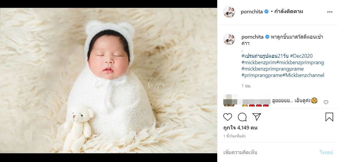 โดยสาว เบนซ์ พรชิตา ได้โพสต์รูปล่าสุดผ่านทางอินสตาแกรมส่วนตัว pornchita เป็นภาพน้องเปรมนอนหลับพริ้ม ใส่ชุดสีขาว มีหูหมีประดับ พร้อมตุ๊กตาหมีวางอยู่ข้าง ๆ และเขียนแคปชั่น ‘พาลูกชิ้นมาสวัสดีตอนเช้าค่าา’ ทำเอาแฟนคลับาหวีด กรี๊ดความน่ารักกันไม่หวาดไม่ไหว แจกหัวใจกันรัว ๆ เลย