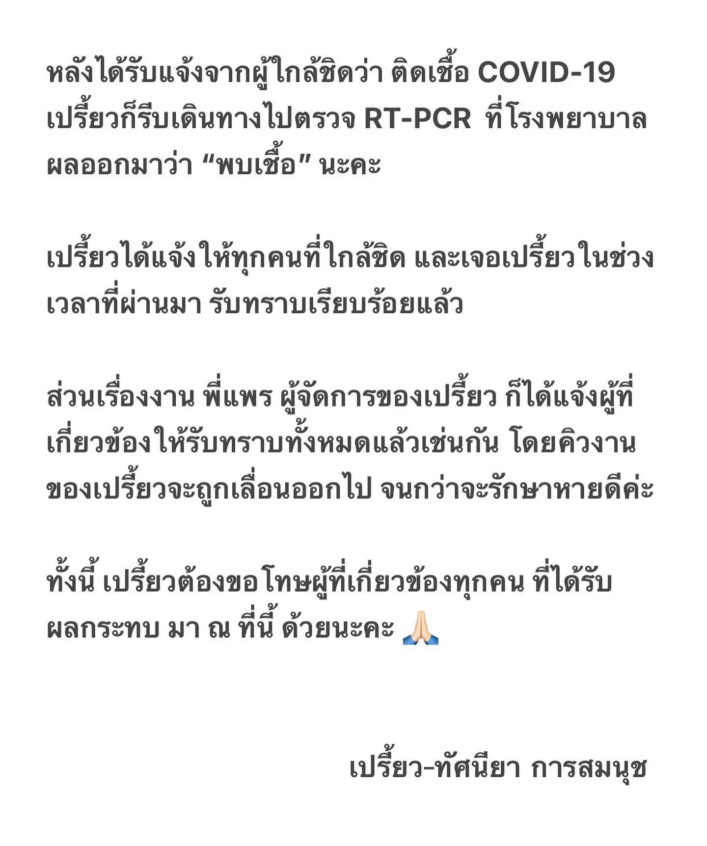 “หลังได้รับแจ้งจากผู้ใกล้ชิดว่า ติดเชื้อ COVID-19 เปรี้ยวก็รีบเดินทางไปตรวจ RT-PCR ที่โรงพยาบาล ผลออกมาว่า “พบเชื้อ” นะคะ เปรี้ยวได้แจ้งให้ทุกคนที่ใกล้ชิด และเจอเปรี้ยวในช่วง เวลาที่ผ่านมา รับทราบเรียบร้อยแล้ว