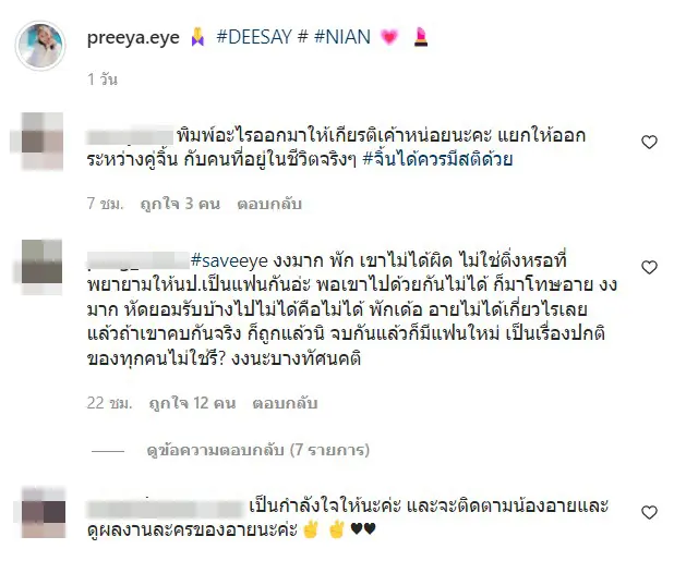 ซึ่งดาราที่ถูกจับตาปรากฏในภาพหลุดหลายคนพุ่งเป้าไปที่ อาย ปรียานัฐ นักแสดงสาวช่องดัง ล่าสุดเกิดกระแสดราม่าหนักมีคนเข้าไปคอมเมนต์ถล่มต่อว่าสาวอาย อย่างมากมาย แต่เจ้าตัวก็ไม่ได้ออกมาเคลื่อนไหวตอบโต้แต่อย่างใด อาทิ พิมพ์อะไรออกมาให้เกียรติเค้าหน่อยนะคะ แยกให้ออกระหว่างคู่จิ้น กับคนที่อยู่ในชีวิตจริงๆ #จิ้นได้ควรมีสติด้วย , #saveeye งงมาก พัก เขาไม่ได้ผิด ไม่ใช่ติ่งหรอที่พยายามให้นป.เป็นแฟนกันอ่ะ พอเขาไปด้วยกันไม่ได้ ก็มาโทษอาย งงมาก หัดยอมรับบ้างไปไม่ได้คือไม่ได้ พักเด้อ อายไม่ได้เกี่ยวไรเลย แล้วถ้าเขาคบกันจริง ก็ถูกแล้วนิ จบกันแล้วก็มีแฟนใหม่ เป็นเรื่องปกติของทุกคนไม่ใช่รึ? งงนะบางทัศนคติ , เป็นกำลังใจให้นะค่ะ และจะติดตามน้องอายและดูผลงานละครของอายนะค่ะ✌️✌️♥️♥️ และอีกมากมาย ส่วนจะใช่เธอจริง ๆ หรือไม่นั้นคงต้องรอเจ้าตัวออกมาชี้แจงเพื่อความชัดเจน